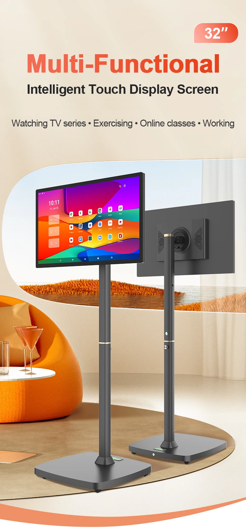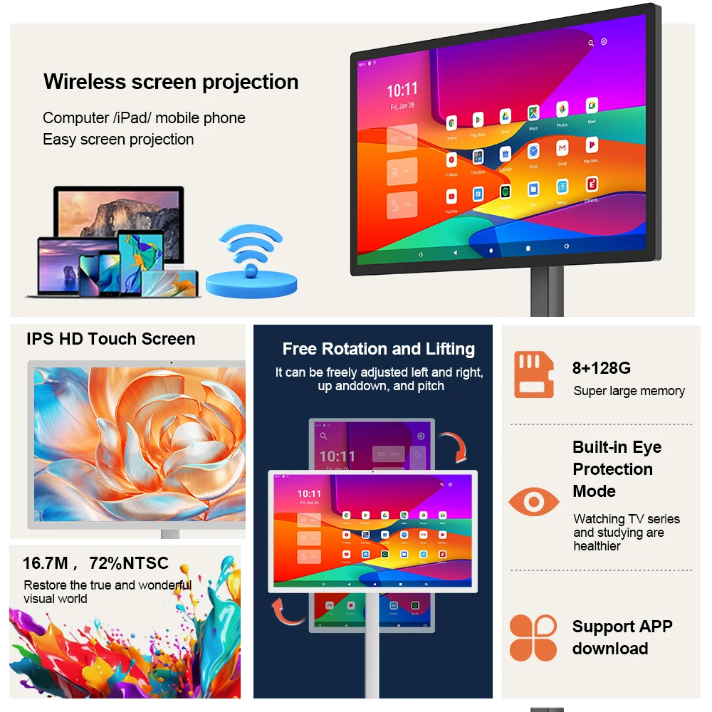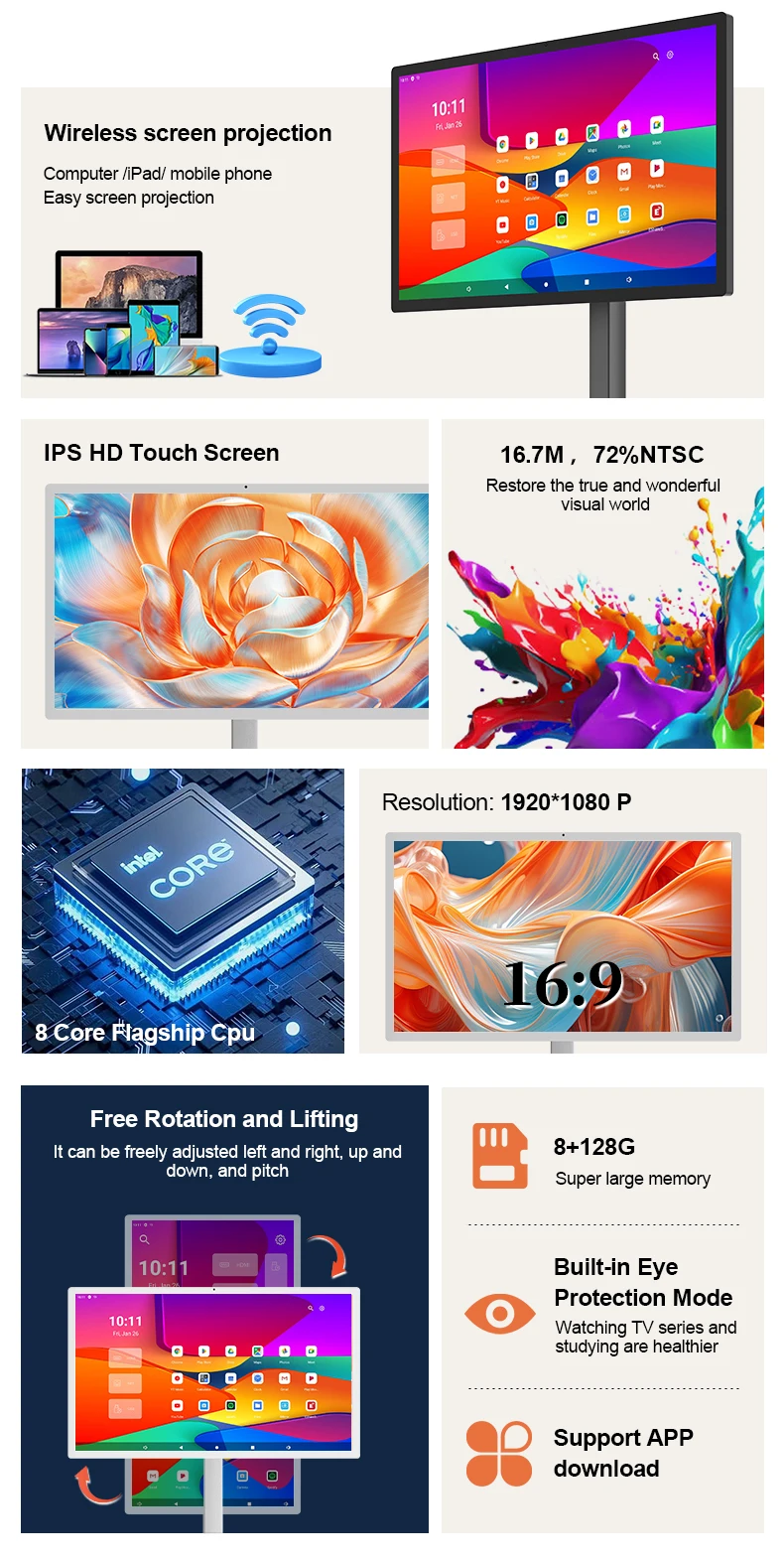 This product can achieve functions such as binge watching, listening to music, online classes, office work, and voice interaction. The screen can be freely switched between landscape and portrait. The elevation angle and depression angle can be adjusted by 20 degrees, and the left and right can be adjusted by 30 degrees. The height can be freely raised and lowered, and the base is equipped with a light tone universal wheel for convenience and flexibility. It also has a built-in 5 million camera. The software is equipped with an electronic whiteboard and screen projection software. One HDMI input can be used as a mobile display.