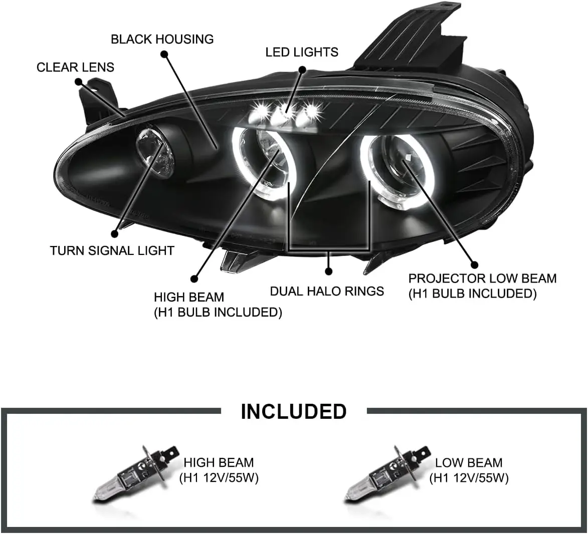 Black Halo Projector Headlights Compatible with 2001-2005 Mazda Miata MX-5, Left + Right Pair Headlamps Assembly