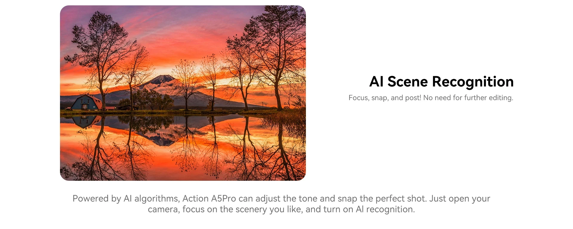 Focus, snap, and post! No need for further editing. Powered by AI algorithms, Action A5Pro can adjust the tone and snap the perfect shot. Just open your camera, focus on the scenery you like, and turn on Al recognition.
