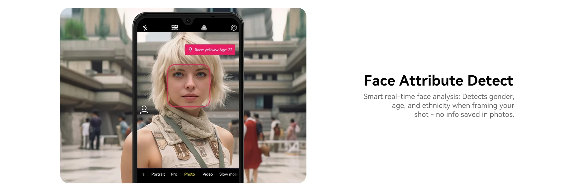 Smart real-time face analysis: Detects gender, age, and ethnicity when framing your shot – no info saved in photos.
