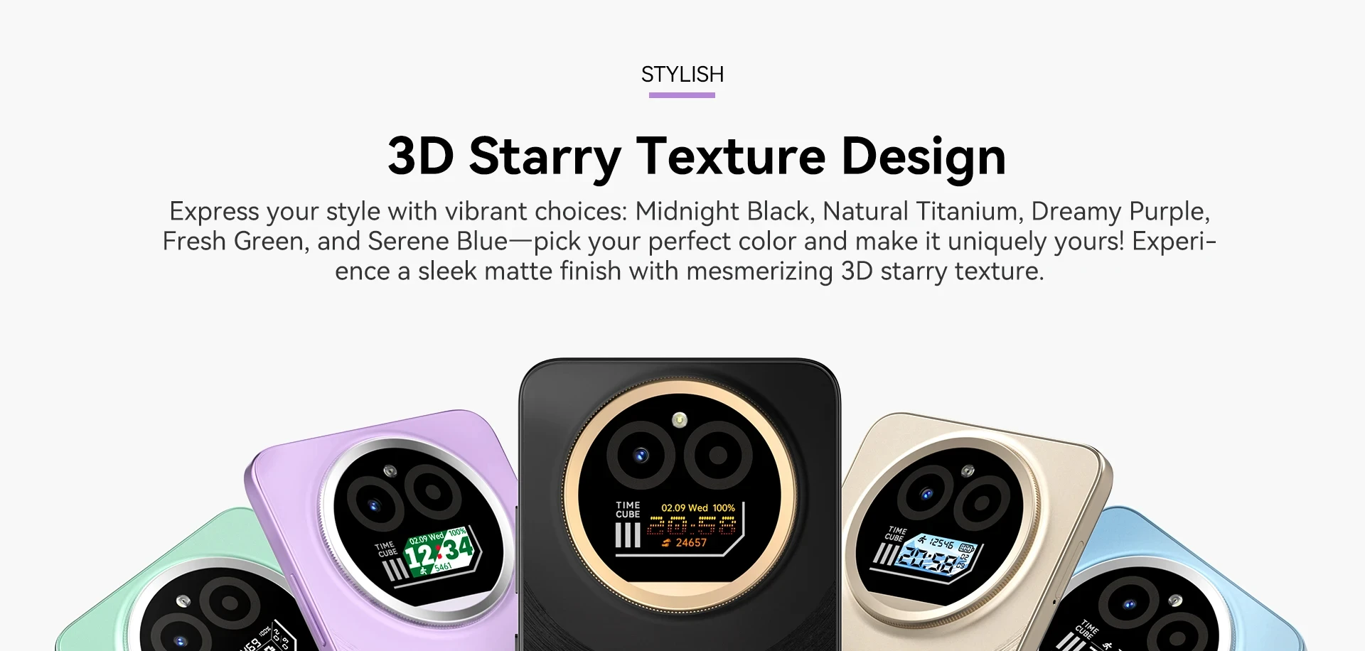 Express your style with vibrant choices: Midnight Black, Natural Titanium, Dreamy Purple, Fresh Green, and Serene Blue—pick your perfect color and make it uniquely yours! Experience a sleek matte finish with mesmerizing 3D starry texture.