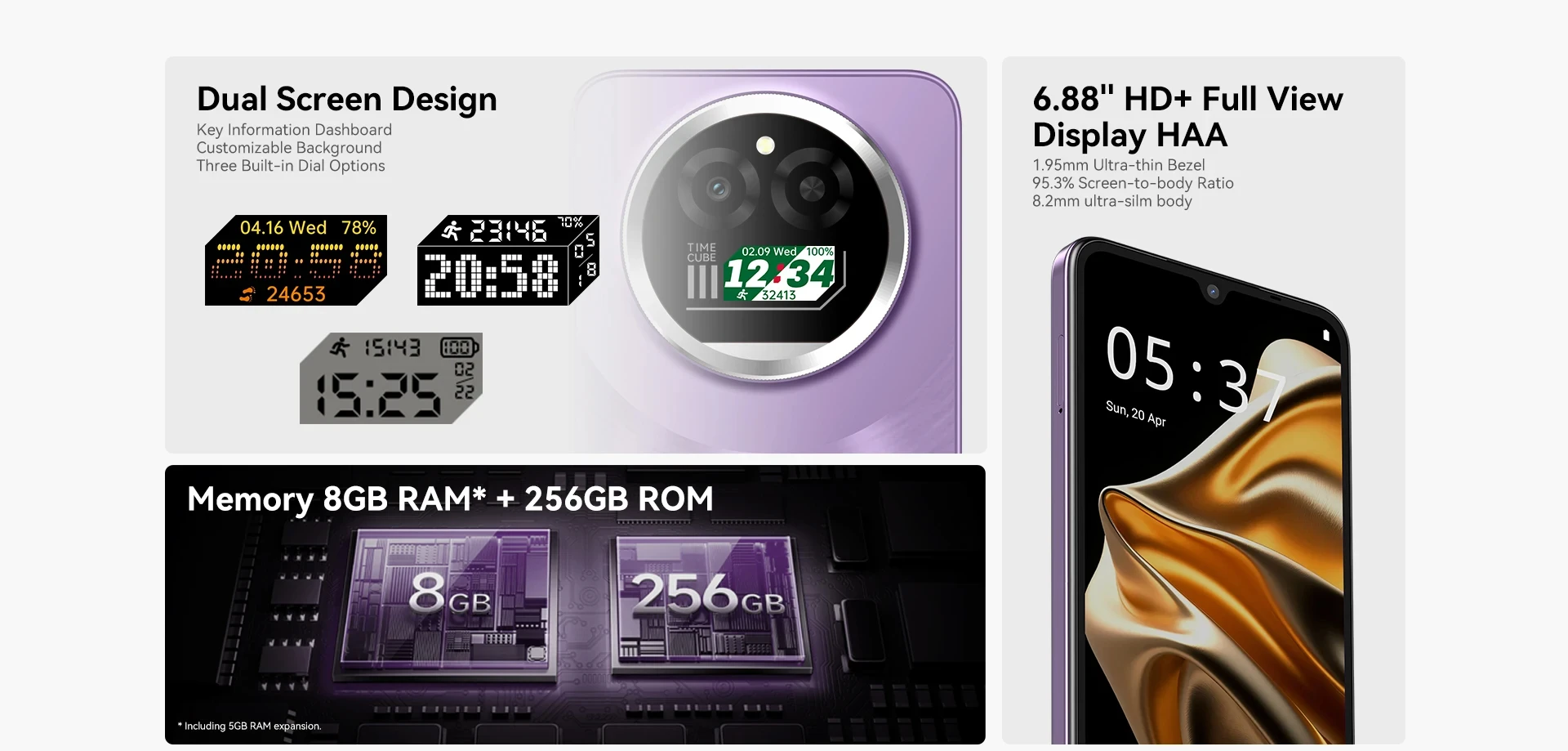 RAM & ROM: 8GB (3GB+Up to 5GB Extended RAM)+256GB ROM