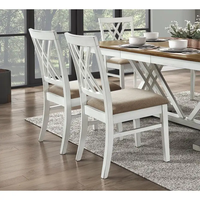 As inviting as a country kitchen, the Brunson Collections charming design is a blend of traditional lines and casual comfort, creating the perfect arrangement for your casual dining room. The two-tone white and oak finish over oak veneer is the perfect canvas for your modern farmhouse décor. The double x-back wood-framed side chairs feature neutral tone fabric seats for complementing contrast to the collections finish. A self-storing butterfly leaf allows for quick tabletop expansion.