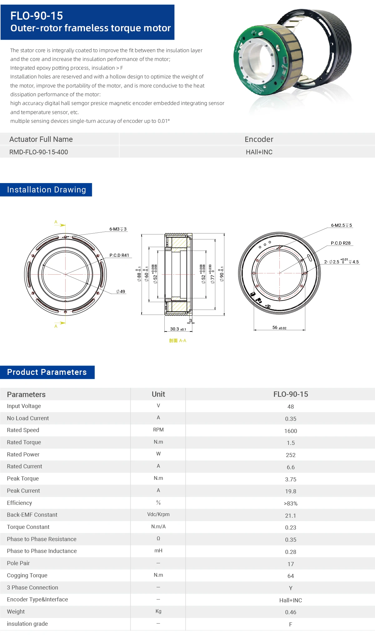 Myactuator NEW FLO-90-15 1600rmp outer rotor frameless torque motor absolute encoder robot arm motor Hall sensor