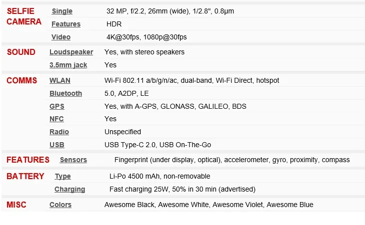 Connectivity USB Type-C, Bluetooth 5.0, NFC (some carrier versions may support it) Wi-Fi 802.11 a/b/g/n/ac、GPS