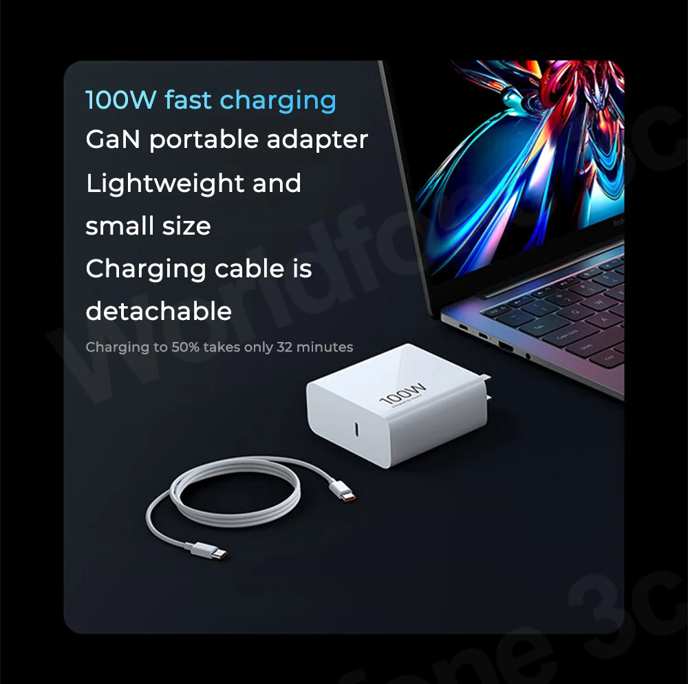 Fast Charging: With the standard 100W GaN adapter, the laptop can be charged to 50% < = 32 minutes when the laptop is powered off at room temperature (25 degrees Celsius) without any additional devices