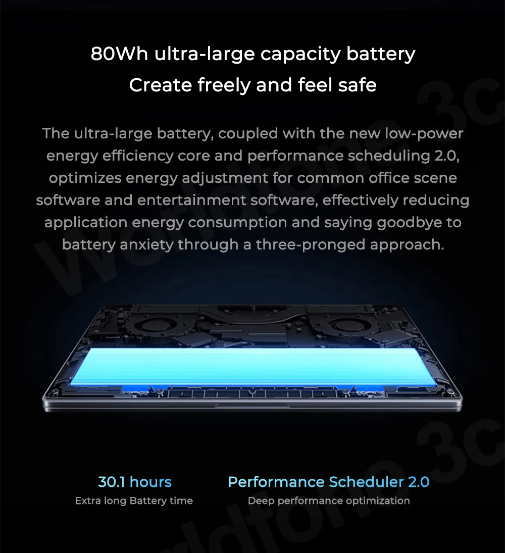 The ultra-large battery, coupled with the new low-power energy efficiency core and performance scheduling 2.0, optimizes energy adjustment for common office scene software and entertainment software, effectively reducing application energy consumption and saying goodbye to battery anxiety through a three- pronged approach.