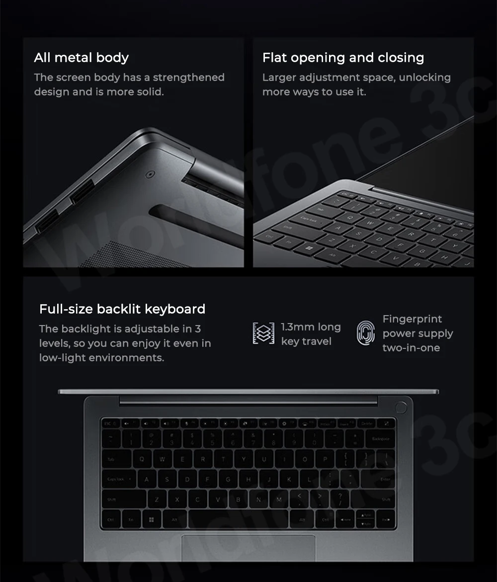 Full-size keyboard, 3-position keyboard backlight, 1.3mm key travel